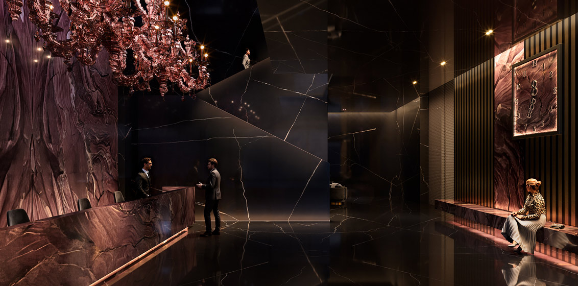The grand residential lobby boasts black marble with a dramatic feature wall of book-matched burgundy marble, and three grand custom-designed Venetian hand-made chandeliers. The signature hues of Dolce&Gabbana— black, gold, and red—are expertly interwoven into the interior design, culminating in a luxurious and cohesive ambiance.
