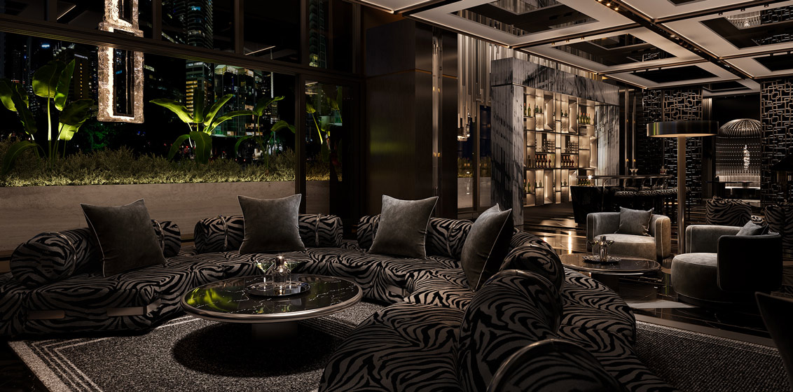 A dramatic bar lounge is set to be a lavish retreat for entertaining and relaxing, and features a harmonious blend of sumptuous textures, including black and white marbles, cast glass, velvet (including the iconic zebra in black-on-black pattern) and polished nickel.