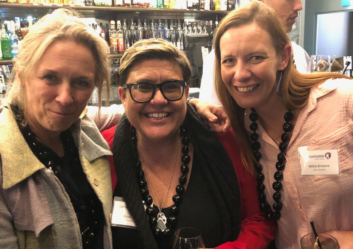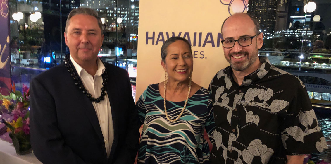 Lead image, from left are: Hawaiian Airlines’ Andrew Stanbury, Managing Director, International & North America Sales, Debbie Nakanelua-Richards, Director of Community & Cultural Relations, Honolulu HQ; and Avi Mannis, Senior Vice President Marketing.
