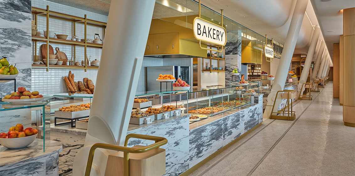 The Lounge features a 140-seat Brasserie restaurant delivering a three-course meal service, with dishes such as Hamachi crudo, steak tartare and lasagna Bolognese. Meanwhile, The Market and Bakery features seasonal culinary offerings plated for walk-up service.