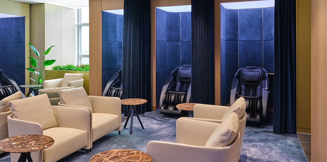 Adjacent to the wellness area, the Serenity Lounge provides a quiet, tranquil space designed for pre-flight peace of mind. Specialty lamp lighting in the Serenity Lounge mimics the light colours affecting the body’s circadian rhythms, helping their body get acclimated to the time zone to which you will be flying.
