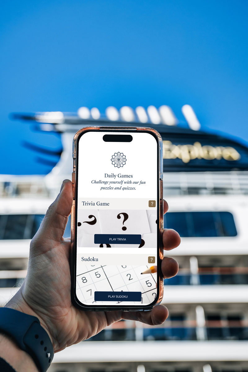 A standout feature of the offerings is the ‘Digital Activities,’ a pioneering initiative within the industry. Utilising special QR codes throughout the ship, guests can engage in unique daily activities on their devices, including Explora Journeys Trivia, Crosswords, and Word Searches themed to the journey’s locale, updated daily. Additionally, timeless games like Sudoku and Chess can be enjoyed at any serene spot on the ship.