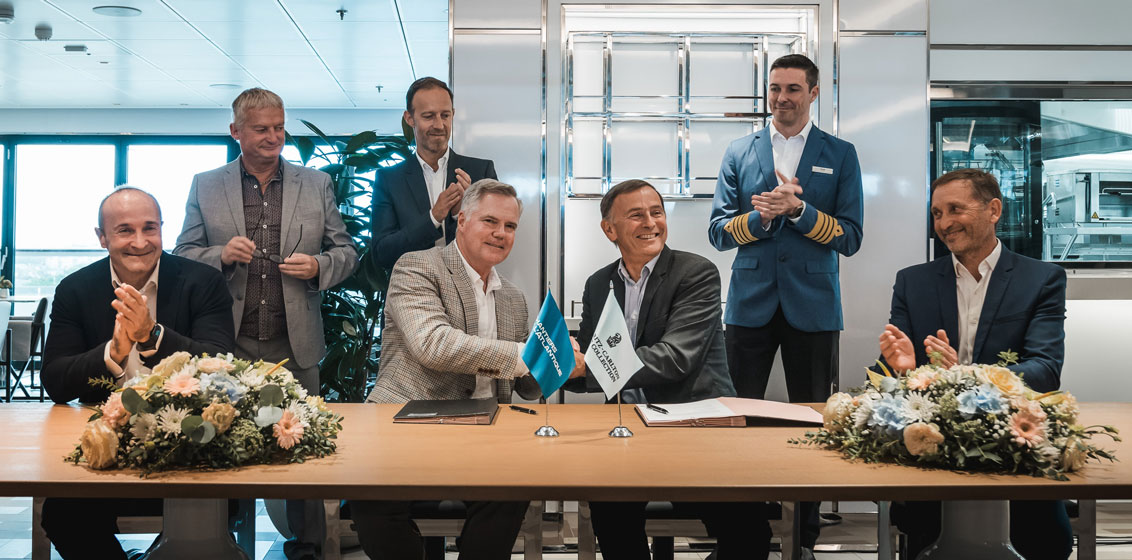Jim Murren, Executive Chairman and Chief Executive Officer of The Ritz-Carlton Yacht Collection; Laurent Castaing, General Manager of Chantiers de l’Atlantique; Steve MacBeath, Captain of Ilma, The Ritz-Carlton Yacht Collection and Arnaud Le Joncour, Senior Vice President of Sales and Marketing of Chantiers de l’Atlantique and Program Director