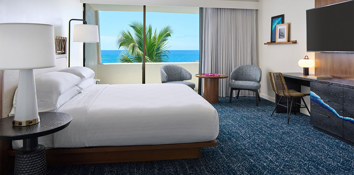 The revitalised 511 guest rooms, suites and meeting spaces artfully blend the property’s heritage and reverence for voyaging with modern aesthetics. Inspired by the concept of “kōī au,” symbolising a flowing current and eloquence, the resort’s design by Looney & Associates seamlessly incorporates oceanic currents and wave motifs into its interiors, offering a genuine reflection of the spirit of Keauhou Bay.