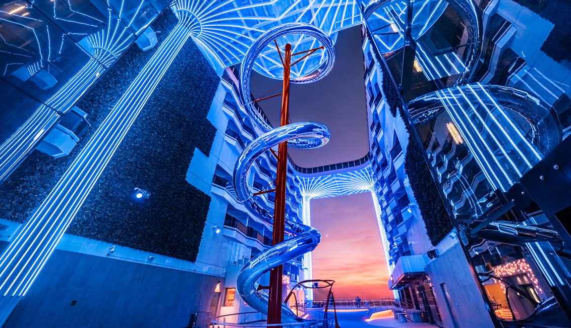 Jaw Drop @ The Spiral – a striking architectural masterpiece and one of the longest dry slides at sea – Jaw Drop takes riders through the jaws of a shark and spiraling down 11-decks through the heart of the World Promenade. The stainless-steel dry slide spirals dramatically through dark and light segments offering glimpses of stunning sea views out the back of the ship in a unique, adrenaline-pumping experience.