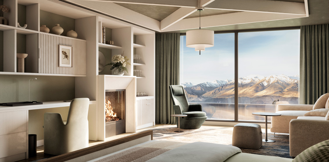 The collection of 15 suites ranges from the intimate 50m² Junior Suite to the extravagant 550m² ROKI Suite. Every suite offers stunning panoramic views over the mountains and Lake Wakatipu, fireplaces, private bath tubs, and walk-in wardrobes.