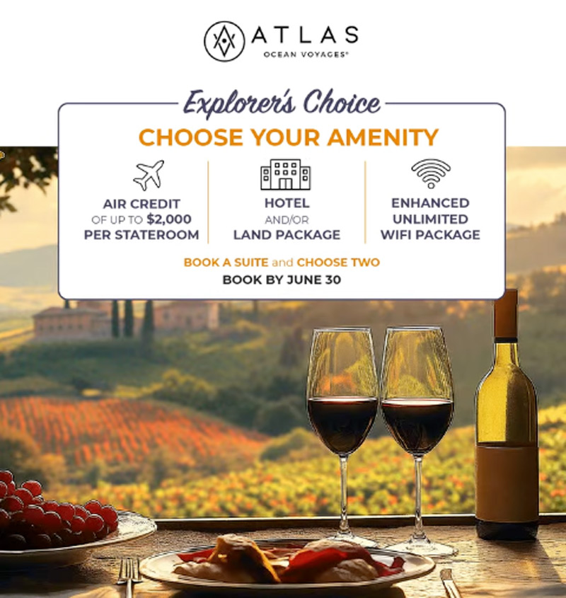 Explorer’s Choice is designed to allow the guest to decide what’s most important, making their Atlas voyage more special and truly unforgettable. Guests booking a stateroom can select one complimentary amenity, while those suite guests may choose two.