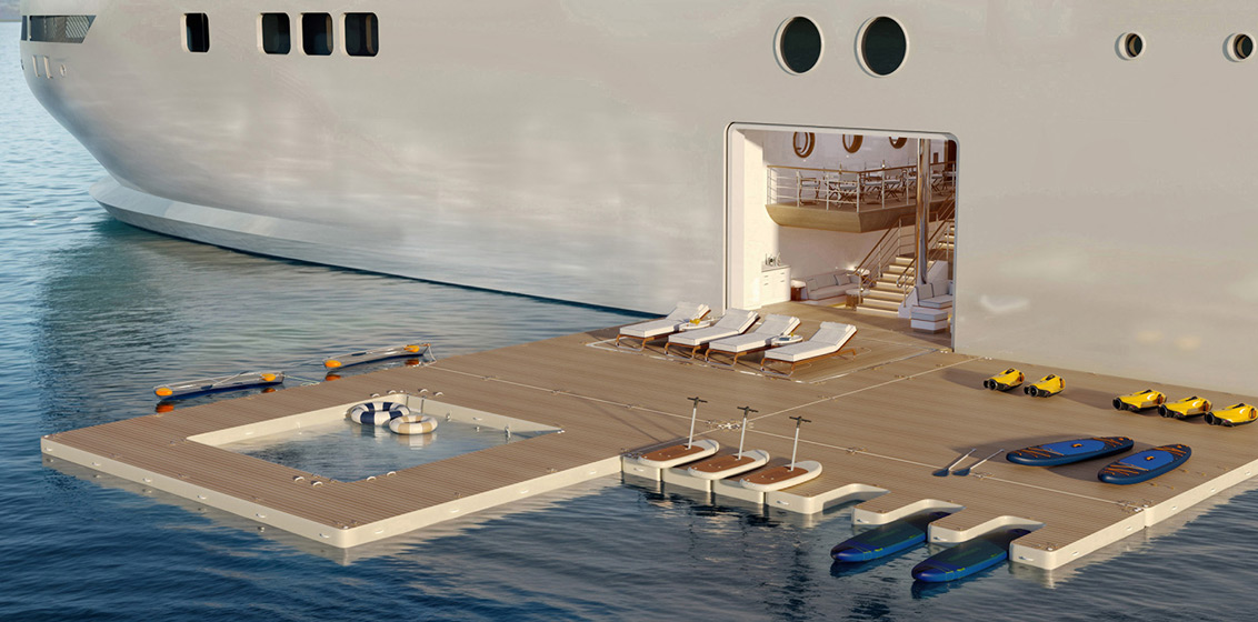 The transverse marina features two retractable platforms – one portside and one starboard side – along with a spacious interior bar and lounge area, the marina spans the yacht, yielding up to 676 square metres (7,275 square feet) of total space on dedicated marina days, offerings options for watersports, wellness, activities, relaxation, dining and more.