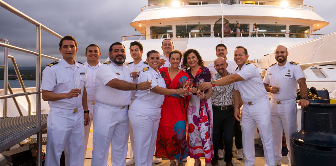Lead image: Doctor Jaime Chavez; Miguel Bermeo, Electrician; Victor Acurio, Chief Engineer; Jose Vergara, Third Officer; Nathaly Alban, Captain of National Geographic Gemini; Julian Puente, Second Officer; Pablo Peña, Eduardo, Technical Superintendent; Ana Esteves, Senior Vice President of Hotel Operations; Natalya Leahy, Lindblad Expeditions CEO; Jhon Iturralde, Captain of National Geographic Delfina; and Victor Cruz, Second Engineer on the bow of National Geographic Gemini just moments before the bottle breaking ceremony.