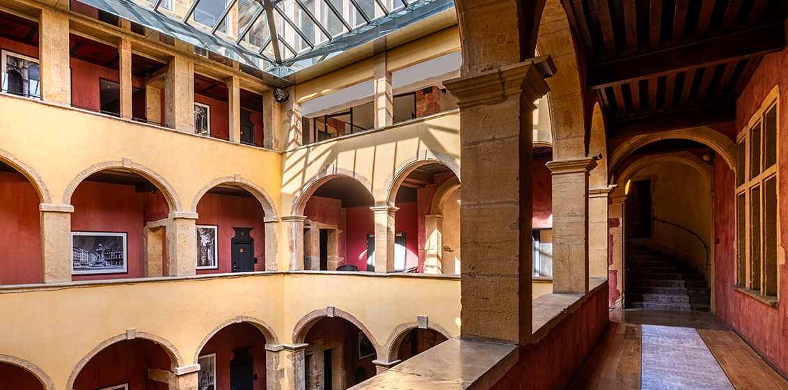 The building has six interior courtyards. The central courtyard has had its 17-meter-high glass roof reintegrated. Its location in Lyon’s UNESCO-listed Vieux Lyon district gives way to cobblestone streets, medieval façades and hidden passageways.