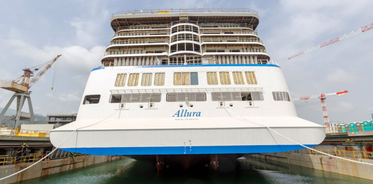 Oceania Cruises marked an important milestone in the construction of its new 1,200-guest ship, Allura, at the Fincantieri shipyard in Sestri Ponente, Italy with the vessel floated out from the dry-dock and moved to the fitting-out berth to begin outfitting the luxurious, designer-inspired interiors.