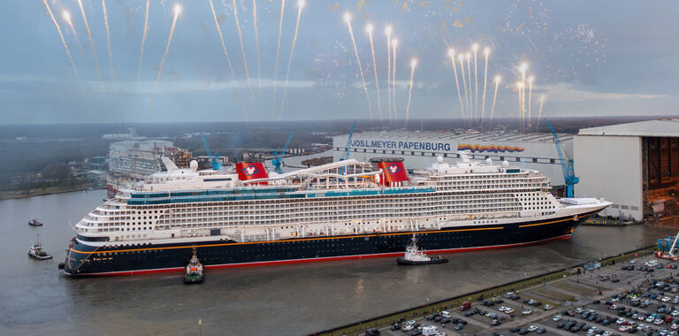 Disney Cruise Line’s newest cruise ship, Disney Wish, hit the water for the first time on Friday [11 February 2022] when it floated out of an enclosed building dock at the Meyer Werft shipyard in Papenburg, Germany.
