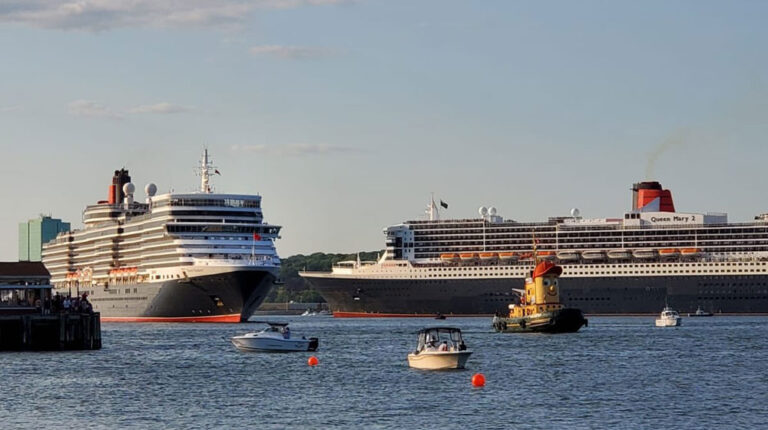 Cunard’s flagship liner Queen Mary 2 had a rare meeting with sister ship Queen Elizabeth on 26 July 2019 in Halifax, Canada – the birthplace of the company’s founder Sir Samuel Cunard.