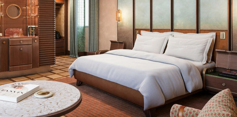 An early look at the interiors of the world’s largest sailing yacht, Orient Express Corinthian, has revealed décor inspired by the golden age of travel.
