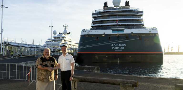 Seabourn welcomed the President of French Polynesia, Moetai Brotherson, on board Seabourn Pursuit on Sunday 7 April 2025, during the ship’s call to Papeete, Tahiti in French Polynesia.