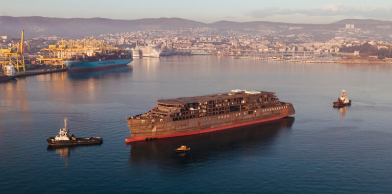 The hull of Seabourn’s first purpose-built expedition ship has arrived at the T. Mariotti shipyard in Genoa, Italy for the vessel’s final fit-out.