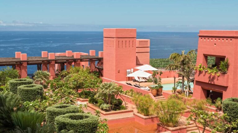 The Ritz-Carlton Abama, on the largest of Spain’s Canary Islands, Tenerife, is honestly the most unusual of that brand that this gal has ever seen. After a 90-minute drive diagonally from north-east to south-west of Tenerife, I entered the top of what is a massive green bed quilt – 400 acres in all – flung over an undulating slope that goes down to the ocean, or at least to a clifftop 100 feet above it.