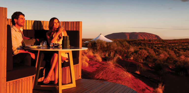 The open-air gastronomic experience offers a magical evening of fine dining on a remote sand dune overlooking Uluru.